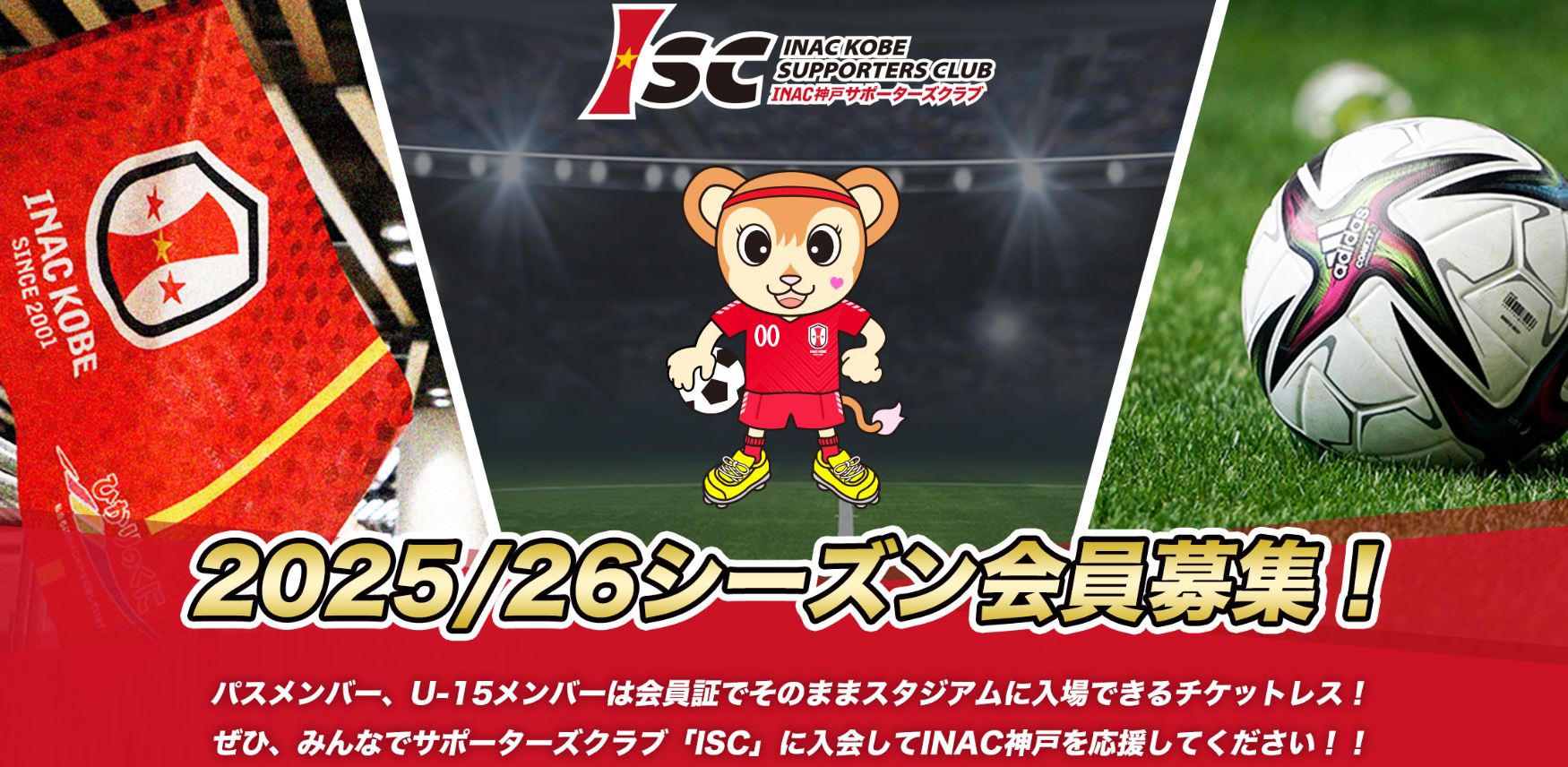 2025/26シーズン ISC(INAC神戸サポーターズクラブ)には、今シーズンも多くのサポーターのみなさまにご入会いただいております。ご入会をいただきましたみなさまに深く御礼を申し上げます。この度、2025/26シーズンの継続 / 新規入会受付を2026年4月30日(木)23時59分をもちましてを終了いたしますのでご案内いたします。ご入会を検討されている方は、お早めに手続きください。来シーズンの受付開始につきましては、準備が整い次第ご案内いたします。引き続き変わらぬご声援をいただきますようお願い申し上げます。
